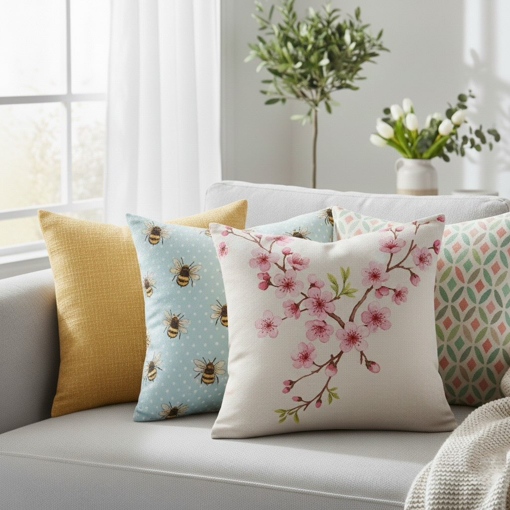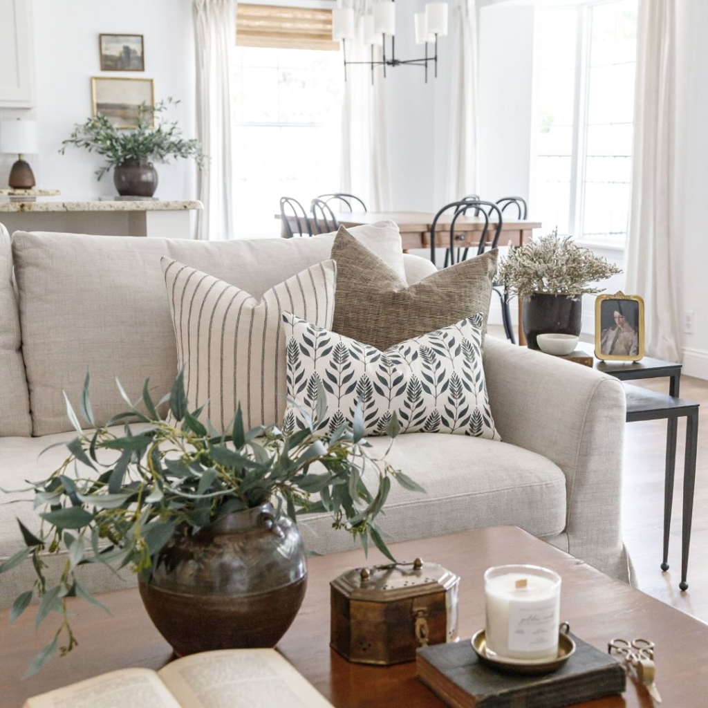 Updating your throw pillows with spring patterns is an easy swap. I choose floral prints and subtle geometric patterns that match my sofa.