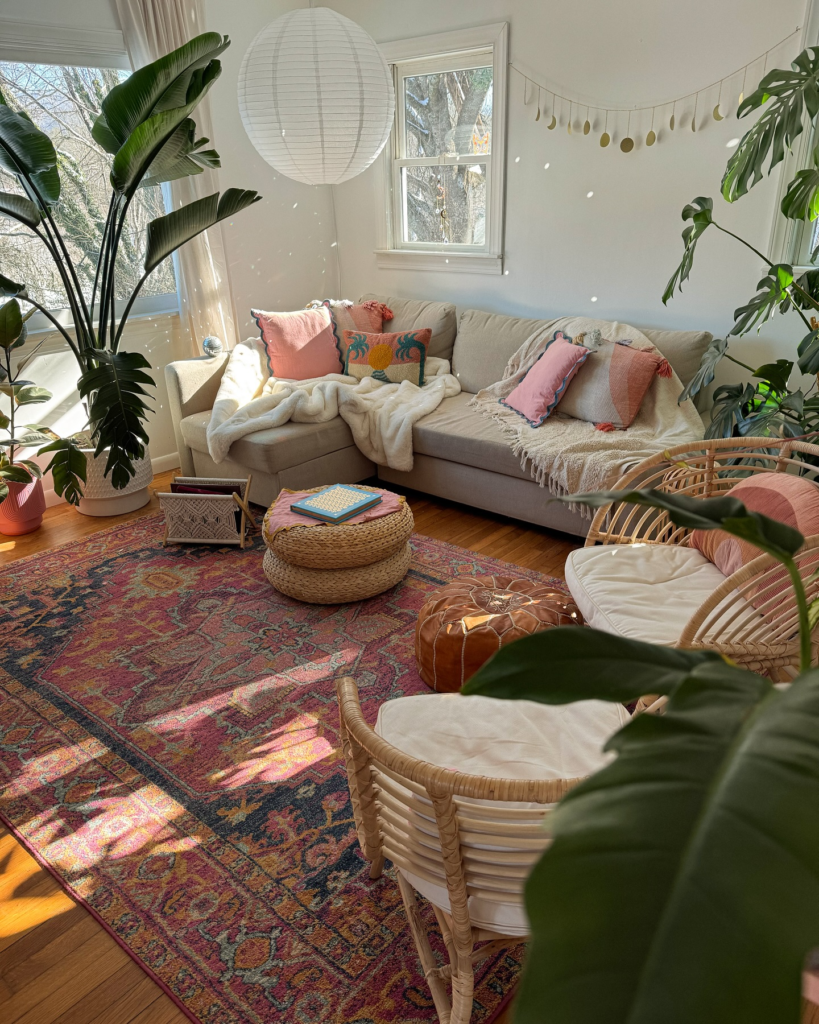 Wicker works well with pastel cushions and indoor plants. This piece immediately made the space feel breezy and casual.