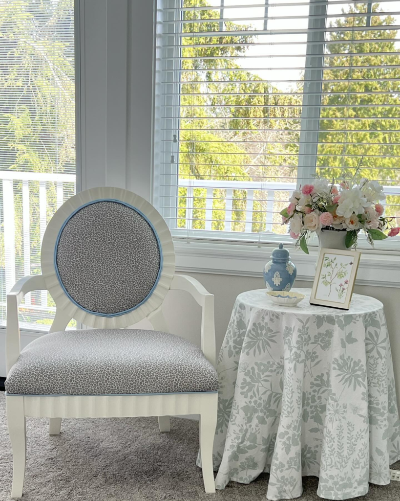 Adding a floral accent chair or ottoman can be a fun spring touch. I found a small chair with subtle floral patterns that immediately lifted the space.