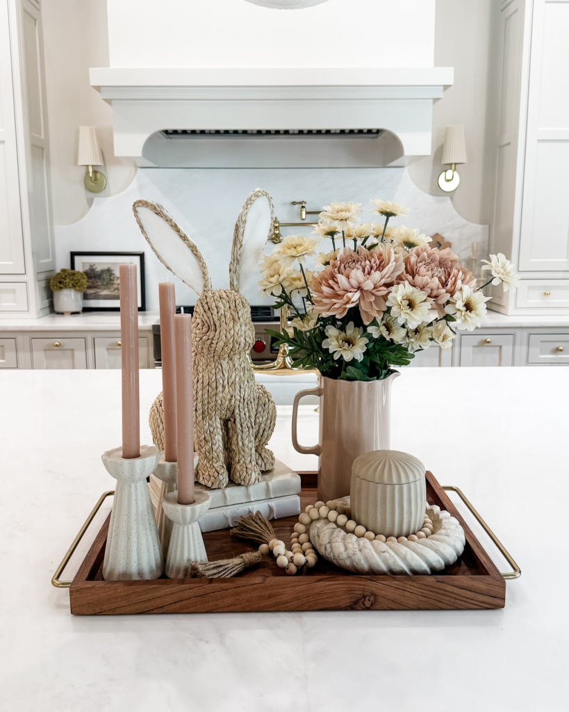 Decorating your coffee table for spring is fun and simple. I like placing a few candles, small vases, or seasonal figurines.