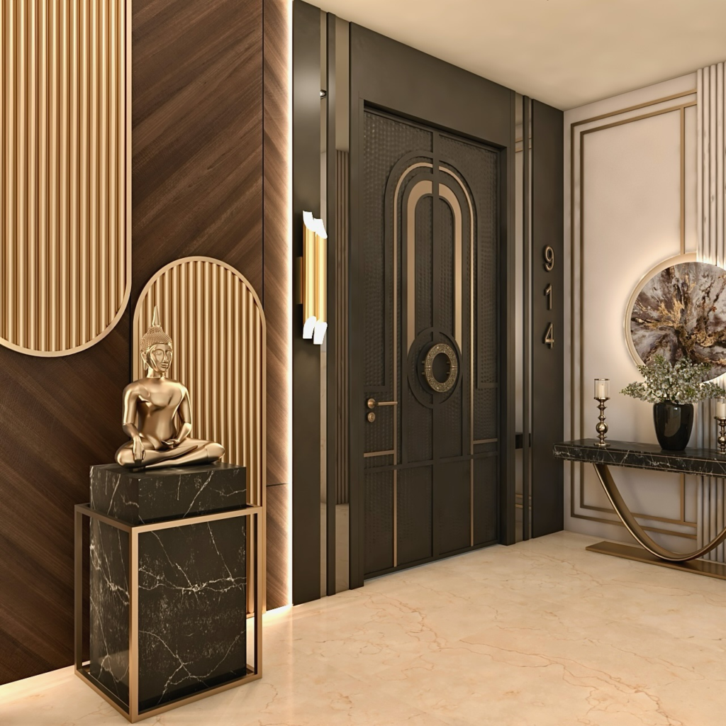 Metallic touches like gold, brass, or chrome add instant elegance. I like incorporating them through mirrors, lamps, or small decor pieces. They reflect light and make the space feel brighter. Even subtle metallic details can make your entry look more refined. It’s an easy way to elevate the overall aesthetic.