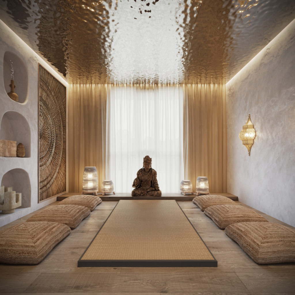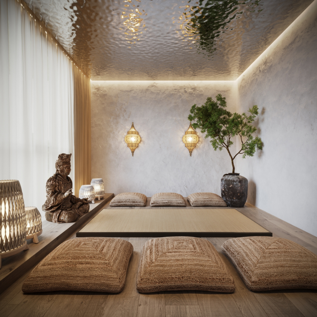 I love practicing in a room without chairs or heavy furniture. Floor cushions, mats, and low tables make the space feel grounded.