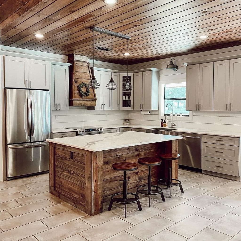 Shiplap walls bring instant texture and character to a kitchen. I’ve seen even plain kitchens transform with just one shiplap wall. It adds depth without making the space feel heavy.