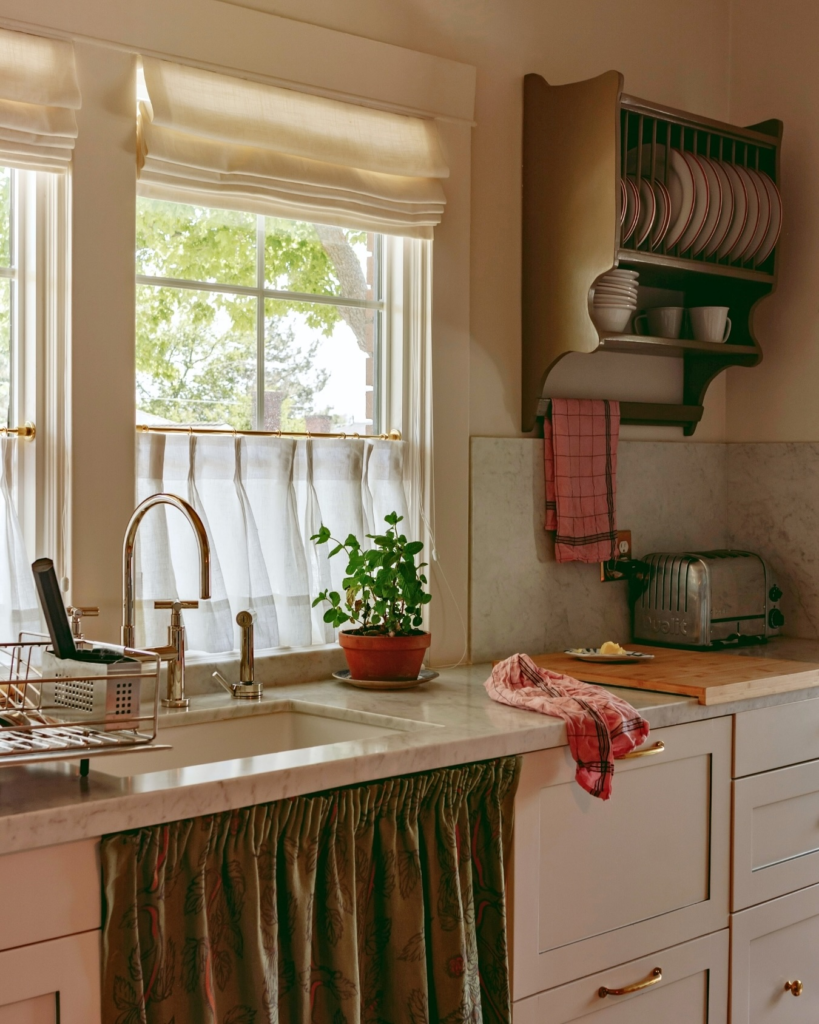 Using curtains under sinks or shelves feels very old-school farmhouse. I love how soft and charming it looks. It’s also practical for hiding storage without bulky cabinets.