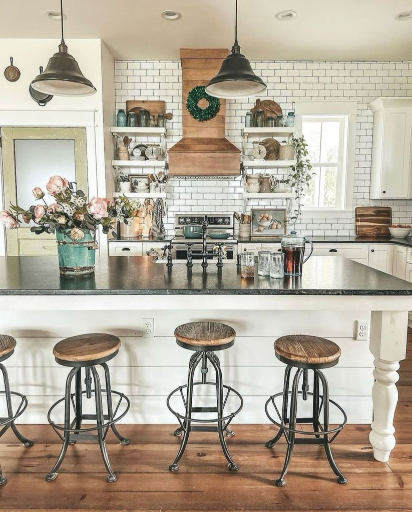 White shiplap keeps things light and airy. It works especially well behind open shelves or around the dining nook. For me, it’s a subtle way to add farmhouse personality.