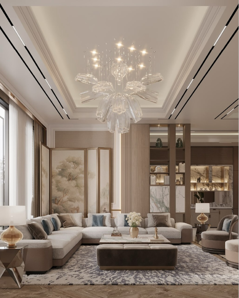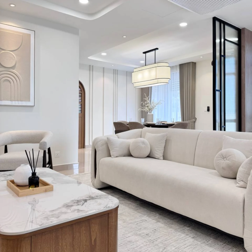 You don’t need bold colors neutral upholstery feels more timeless. This kind of sofa instantly makes the space feel polished and put together.