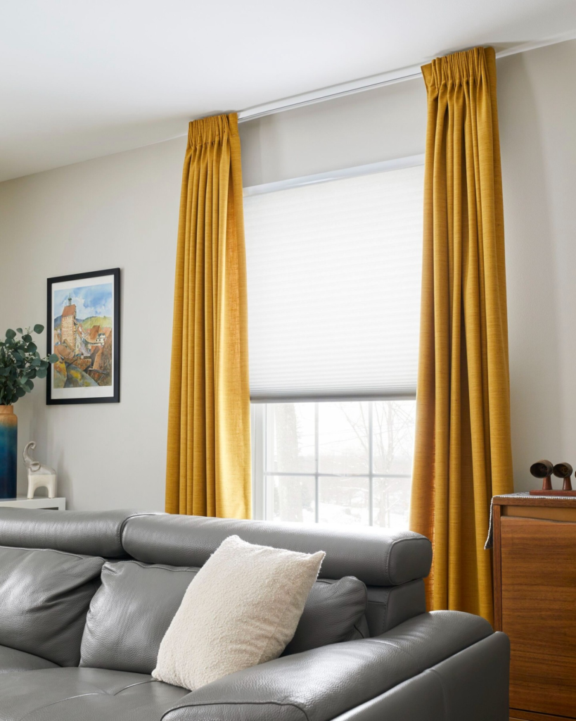 Avoid heavy patterns and keep it clean. When curtains touch the floor, the space feels more expensive and well-designed.