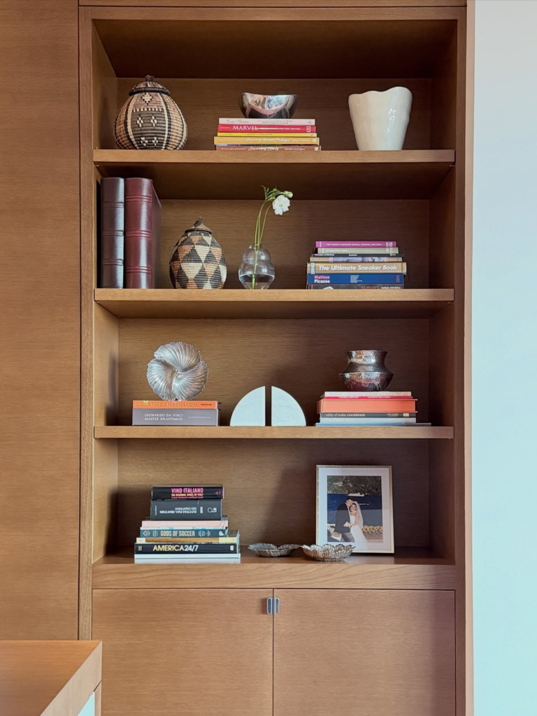 Built-in shelves look both modern and classic. I style mine with books, vases, and framed photos.