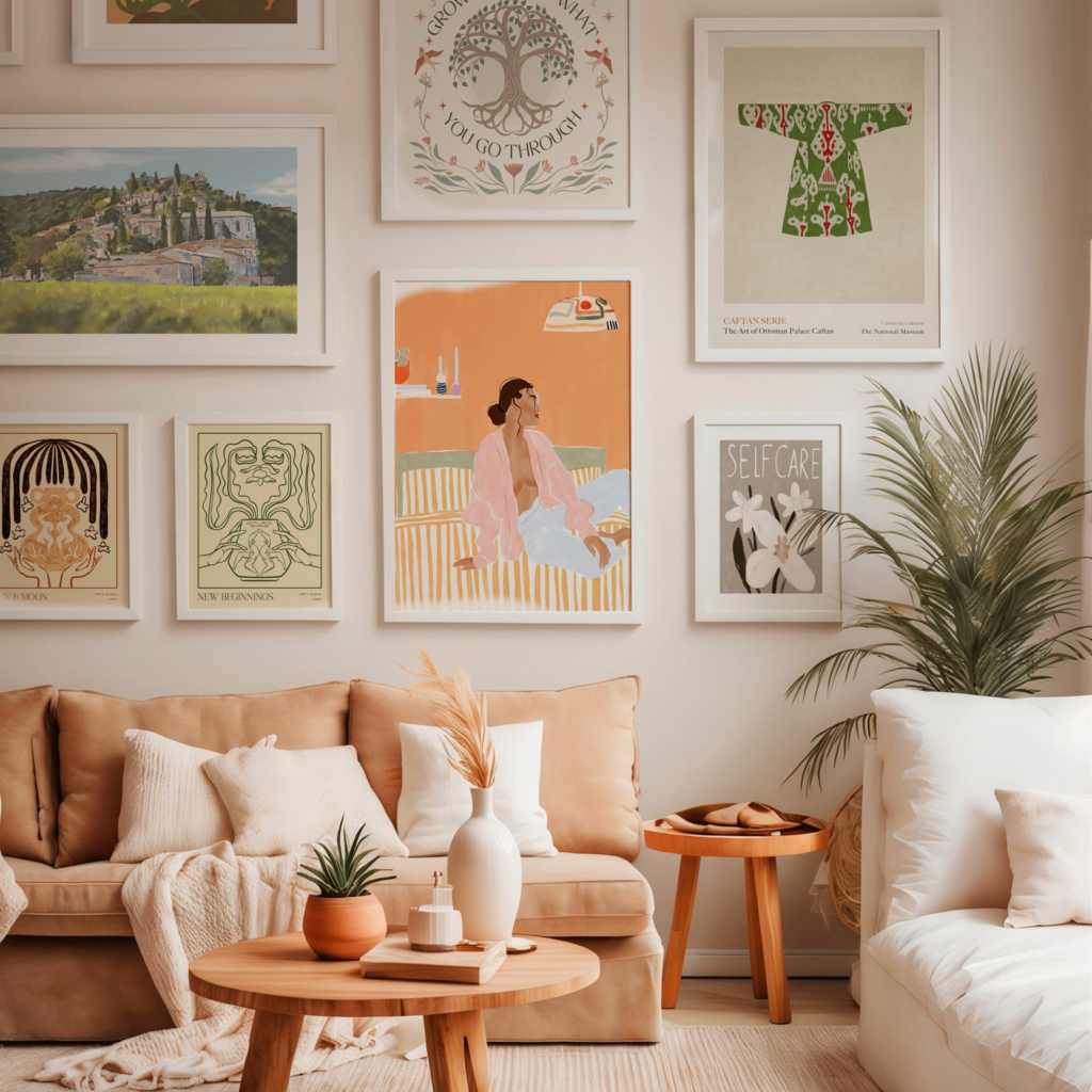 Matching artwork frames in neutral tones keeps your décor cohesive. I use wooden or black frames for a polished, timeless look.