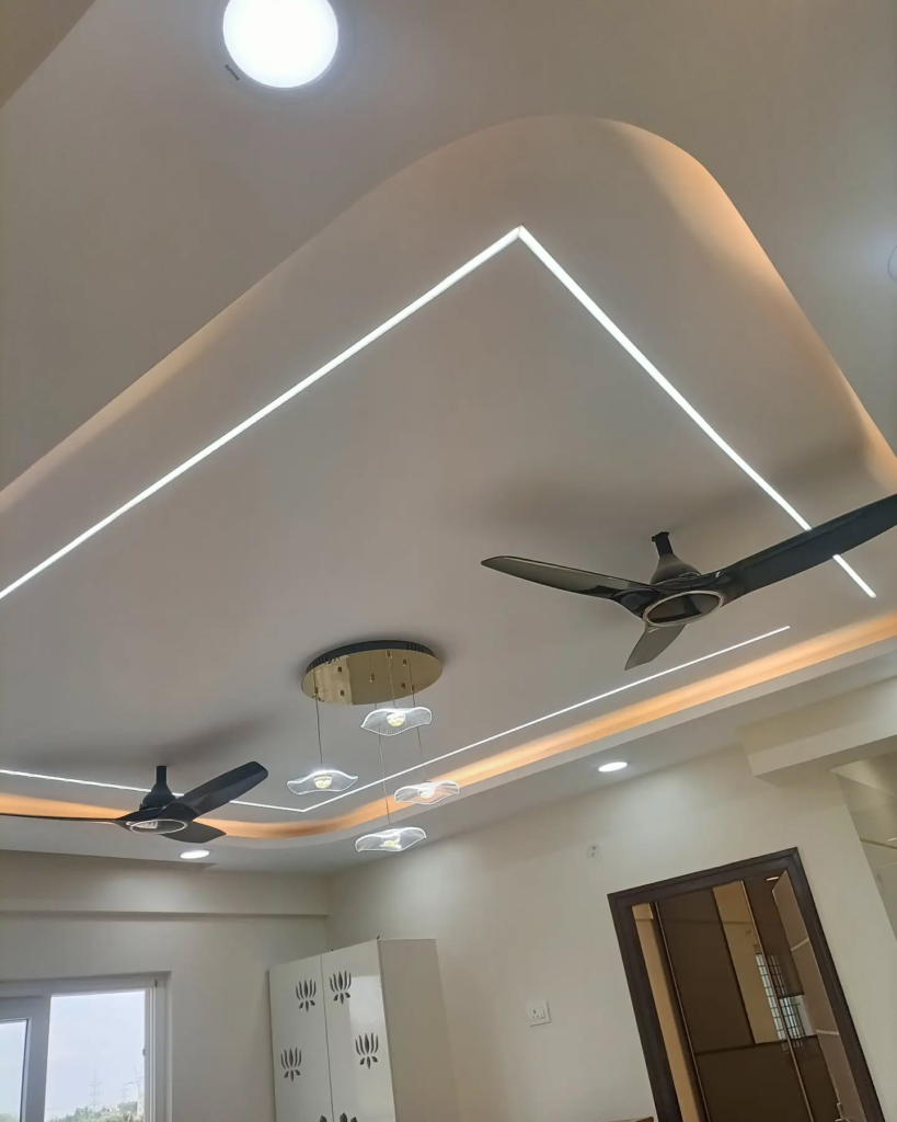 Sometimes less really is more, and this ceiling proves it. A flat, minimal false ceiling keeps the focus on furniture and decor.