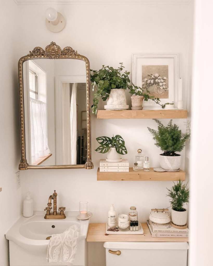 Open shelves can replace bulky cabinets, and I found them perfect for a small bathroom makeover. I used floating shelves above the toilet and vanity, which kept essentials handy while visually opening the space. Open shelving keeps your bathroom stylish and functional.
