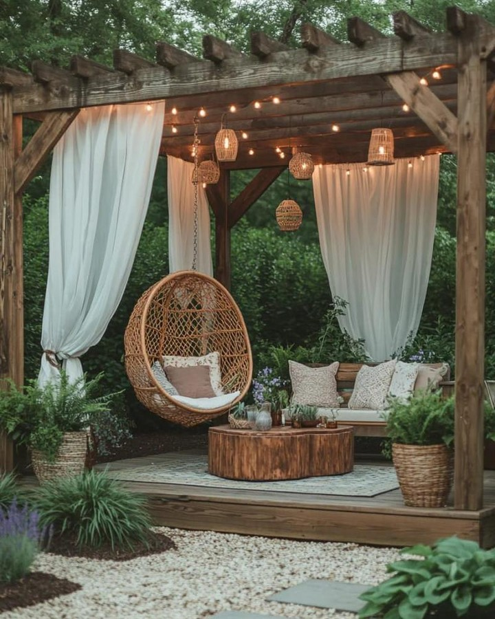 I tried this style and it instantly felt relaxed and artistic. It’s not about perfection, it’s about comfort and personality. This pergola feels like a personal retreat.