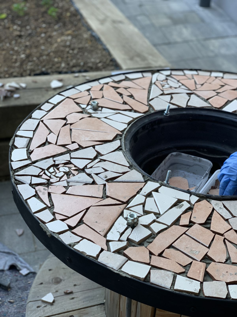 For a creative twist, I added mosaic tiles around the fire pit. I picked bright colors that pop and carefully glued them to the exterior.