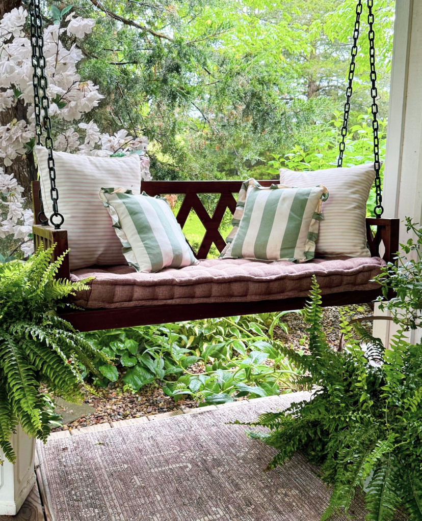 A wooden bench swing gives a more social feel. I built one that seats two people comfortably, and we often use it for chats or reading together. The slow swinging motion is calming, and it’s perfect for small families.