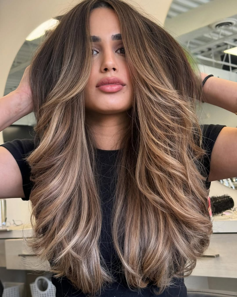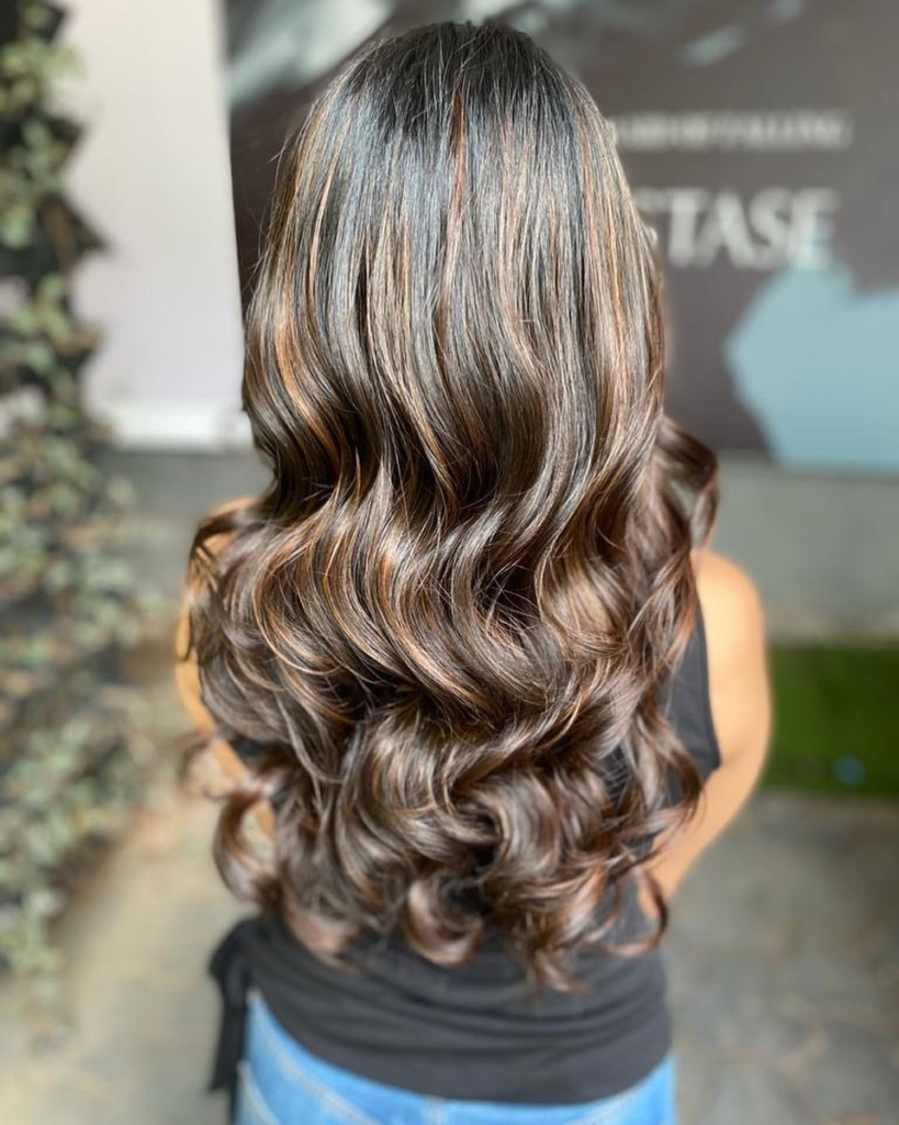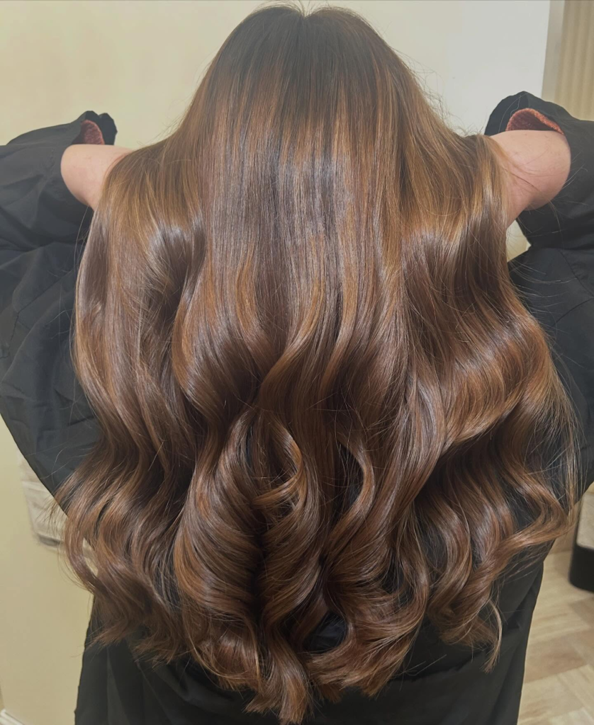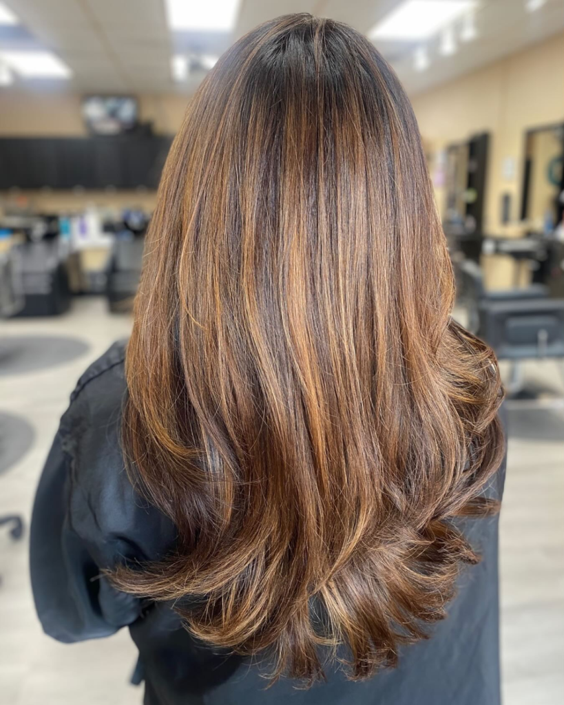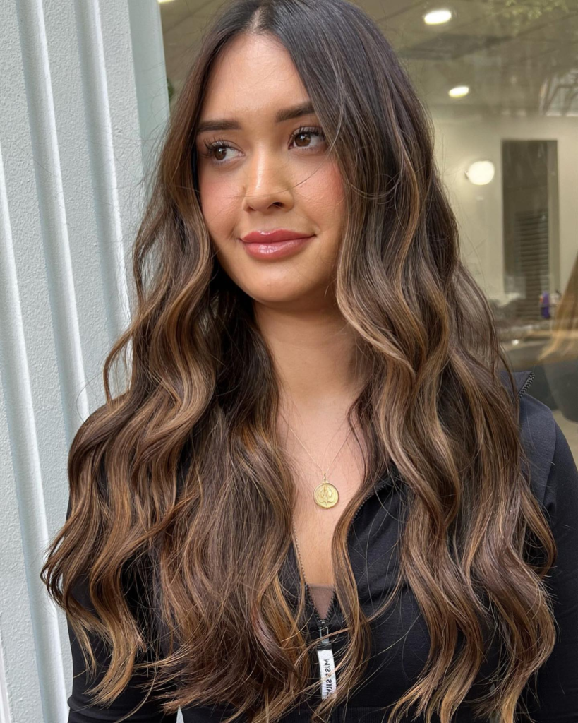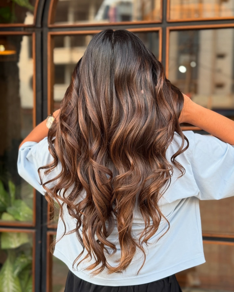 Chestnut brown paired with golden tips creates a soft, romantic look. I love how this style brightens your overall appearance while keeping the hair grounded in rich brunette tones.