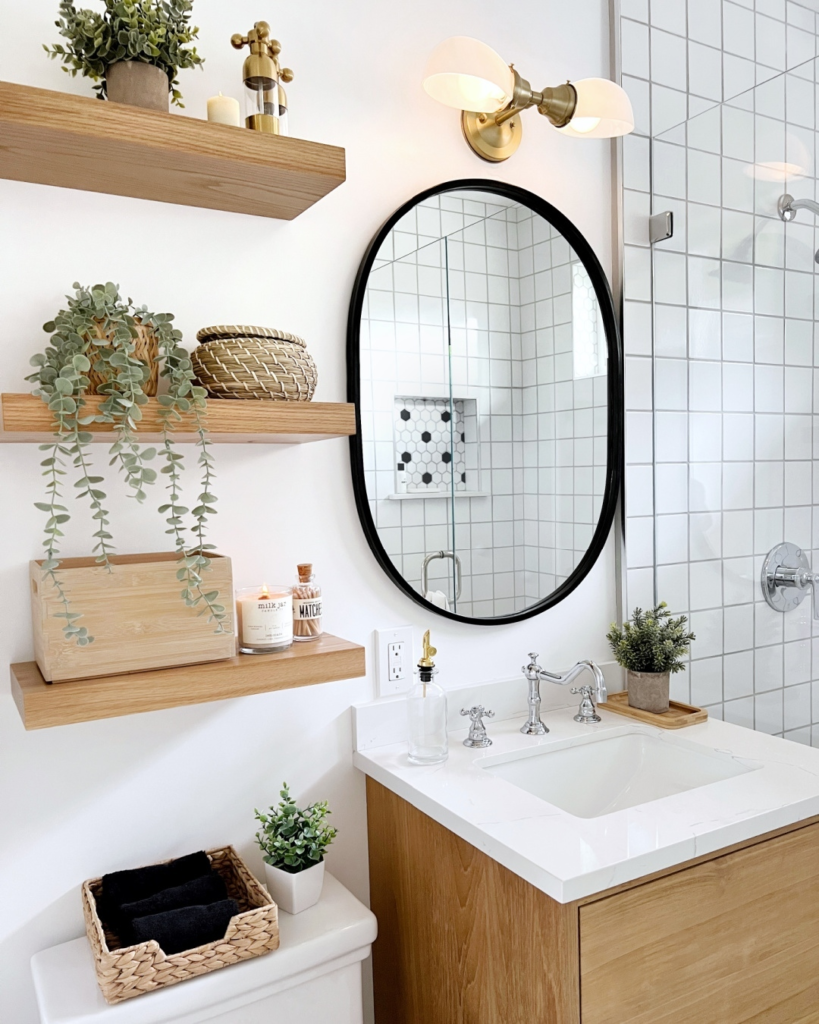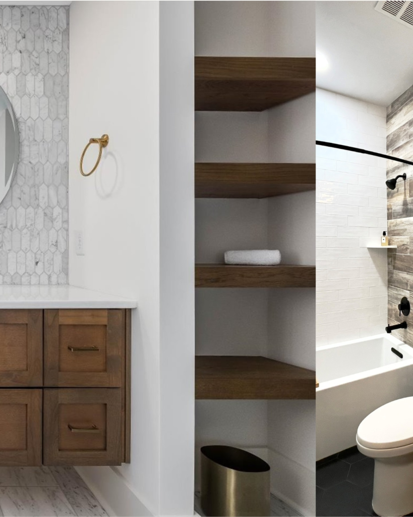 Floating shelves saved my life when I ran out of storage. They give you space for essentials like extra toilet paper and hand towels without taking up floor space.