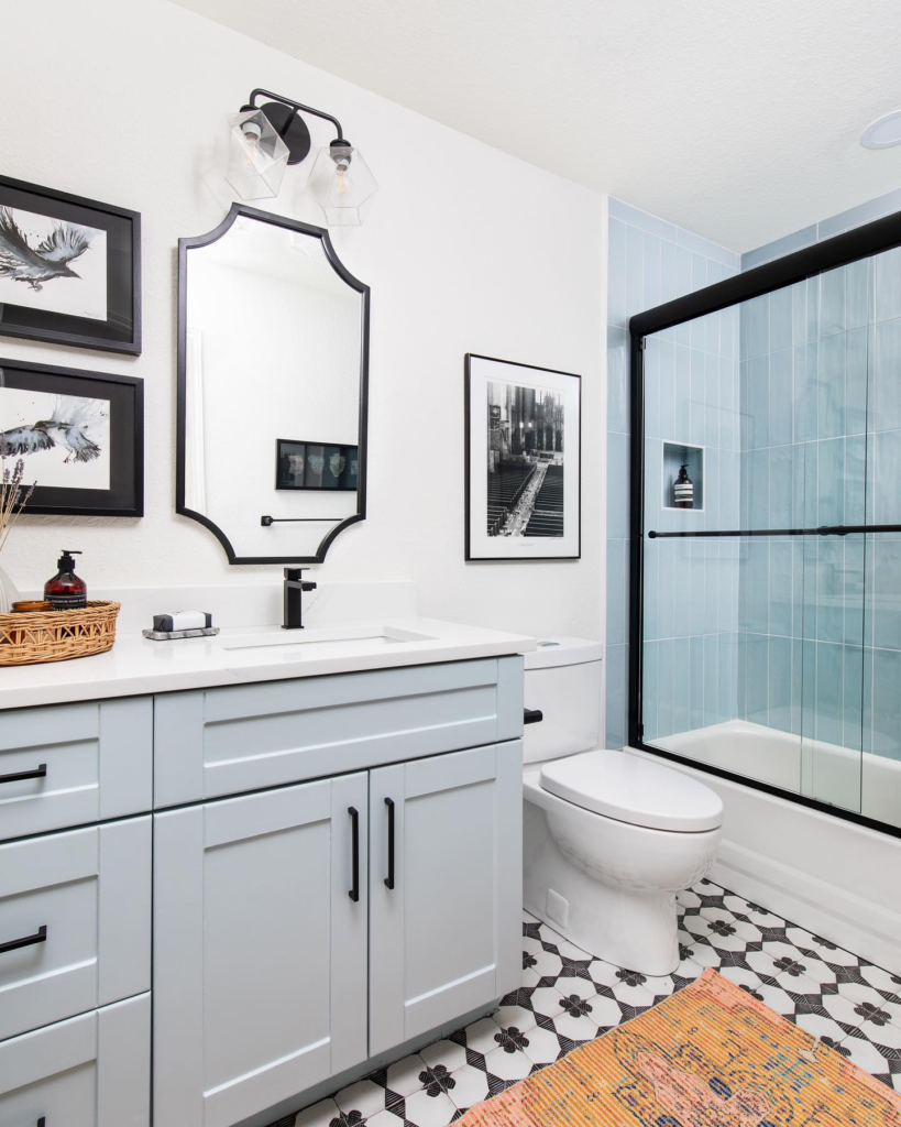 One feature wall can completely change the vibe. I used patterned tiles behind the toilet, and now that wall is the focal point.