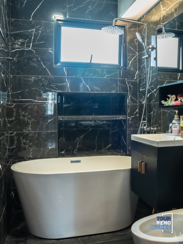 Matching fixtures make the space feel more coordinated. I chose matte black for my tap, flush button, and towel hook.