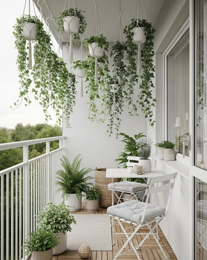 Hanging plants have completely transformed my balcony. I personally love ferns because they give that dense, jungle-like feel without taking up floor space. I hang them at different heights, and it makes the balcony feel more layered and private.