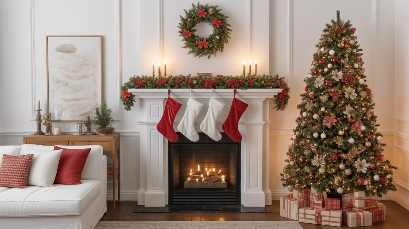 If you’re a fan of tradition, you can’t go wrong with red bows, green garlands, and classic stockings. Add candy cane accents or poinsettias for extra flair.