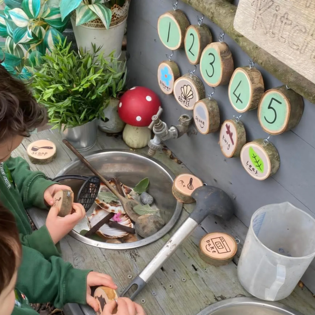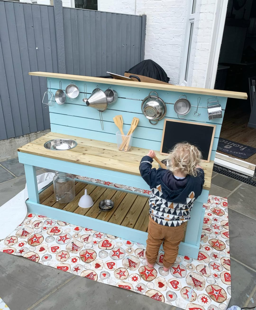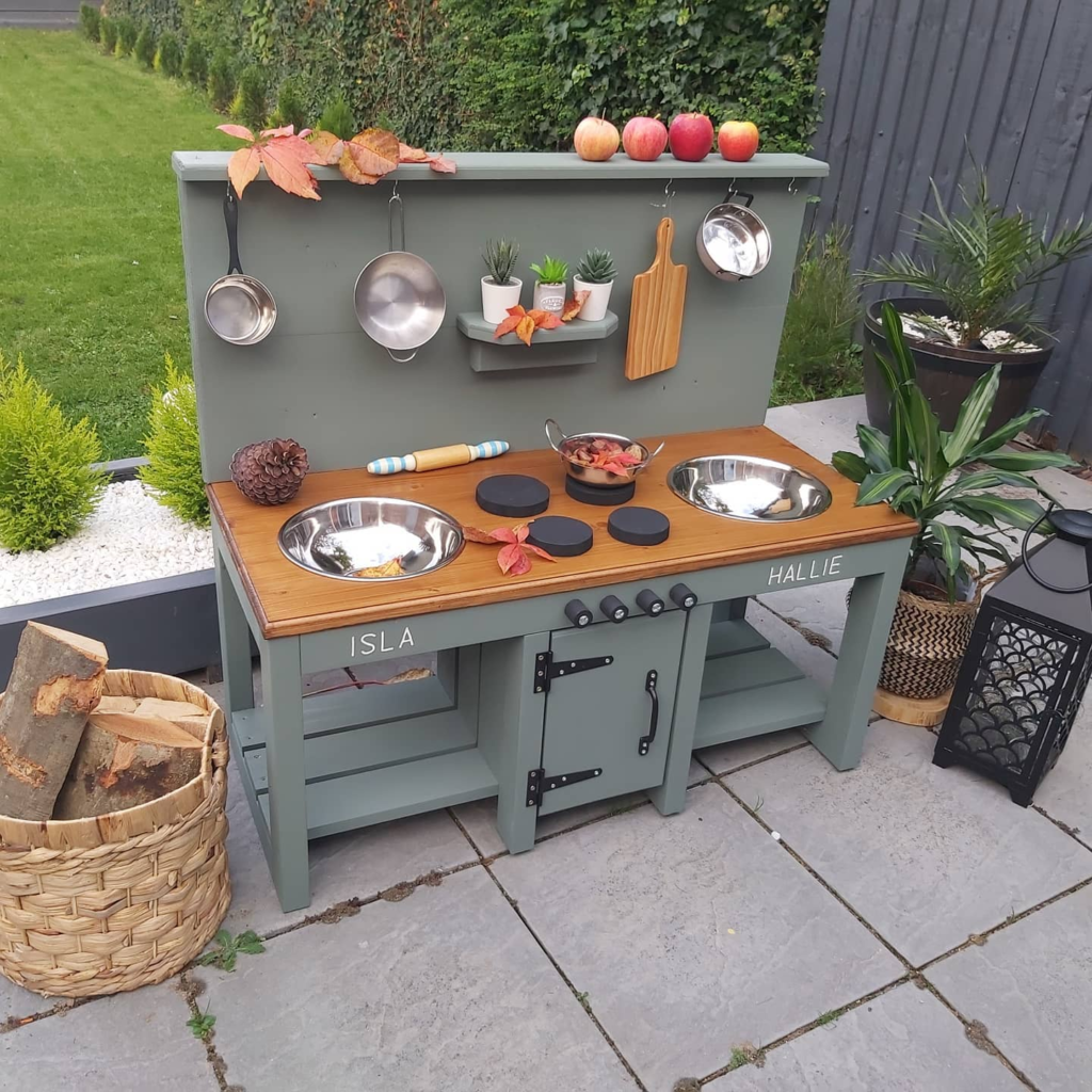I had an old outdoor play table that I didn’t use much. Adding some shelves underneath and a couple of bowls as sinks instantly turned it into a mud kitchen. I love how it uses existing furniture, making it practical and eco-friendly.