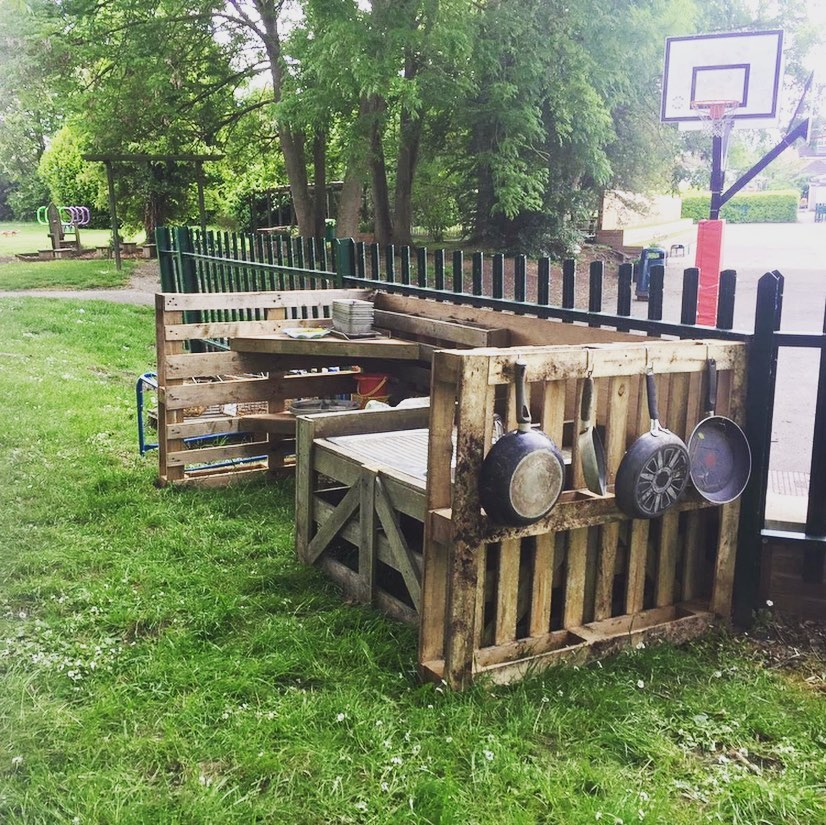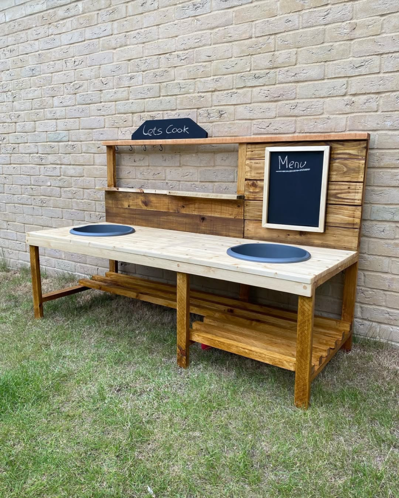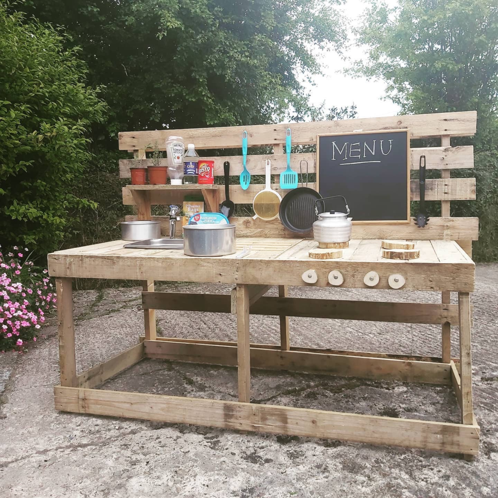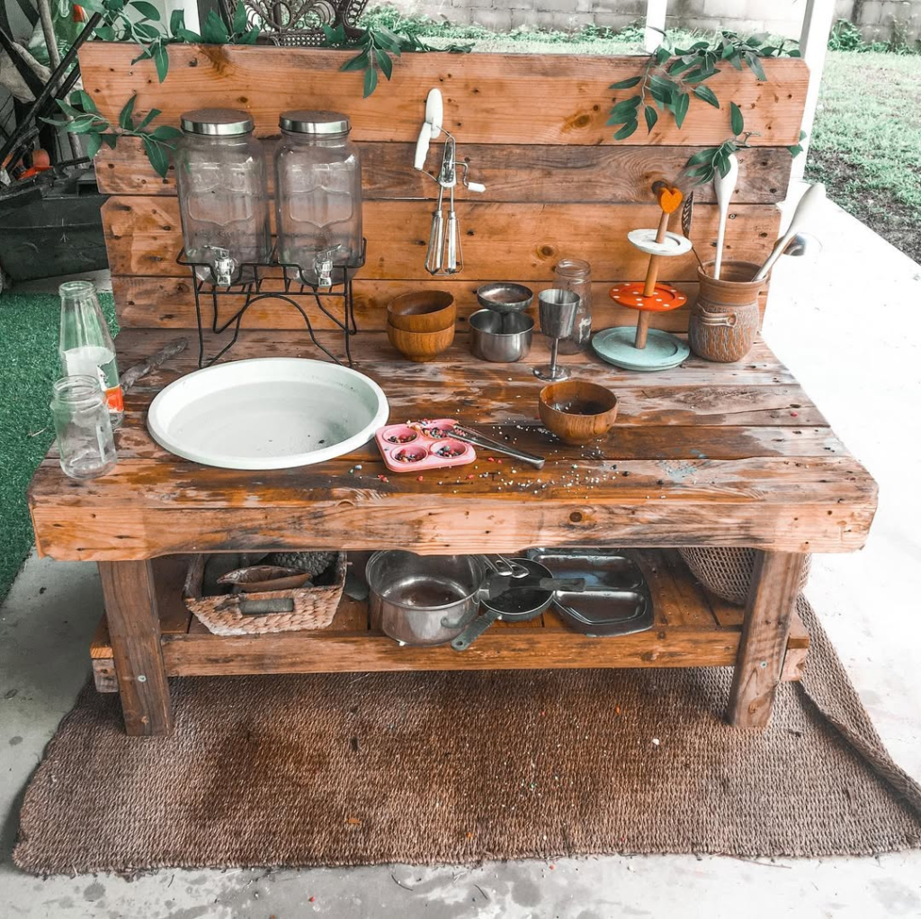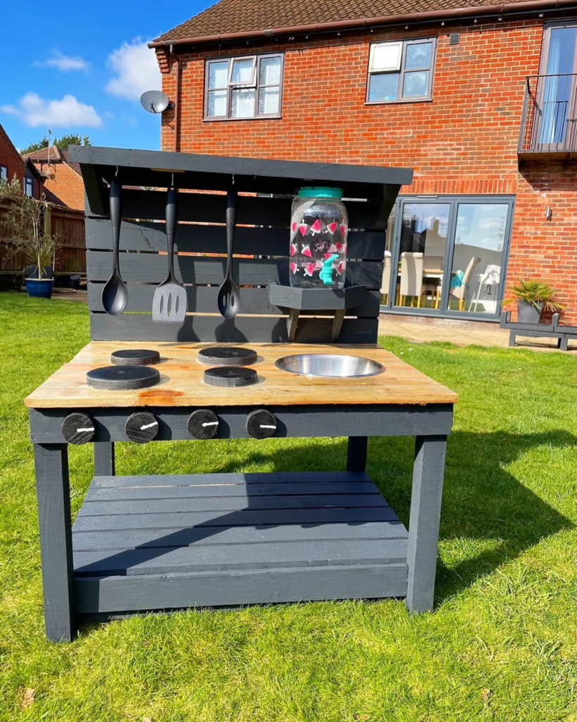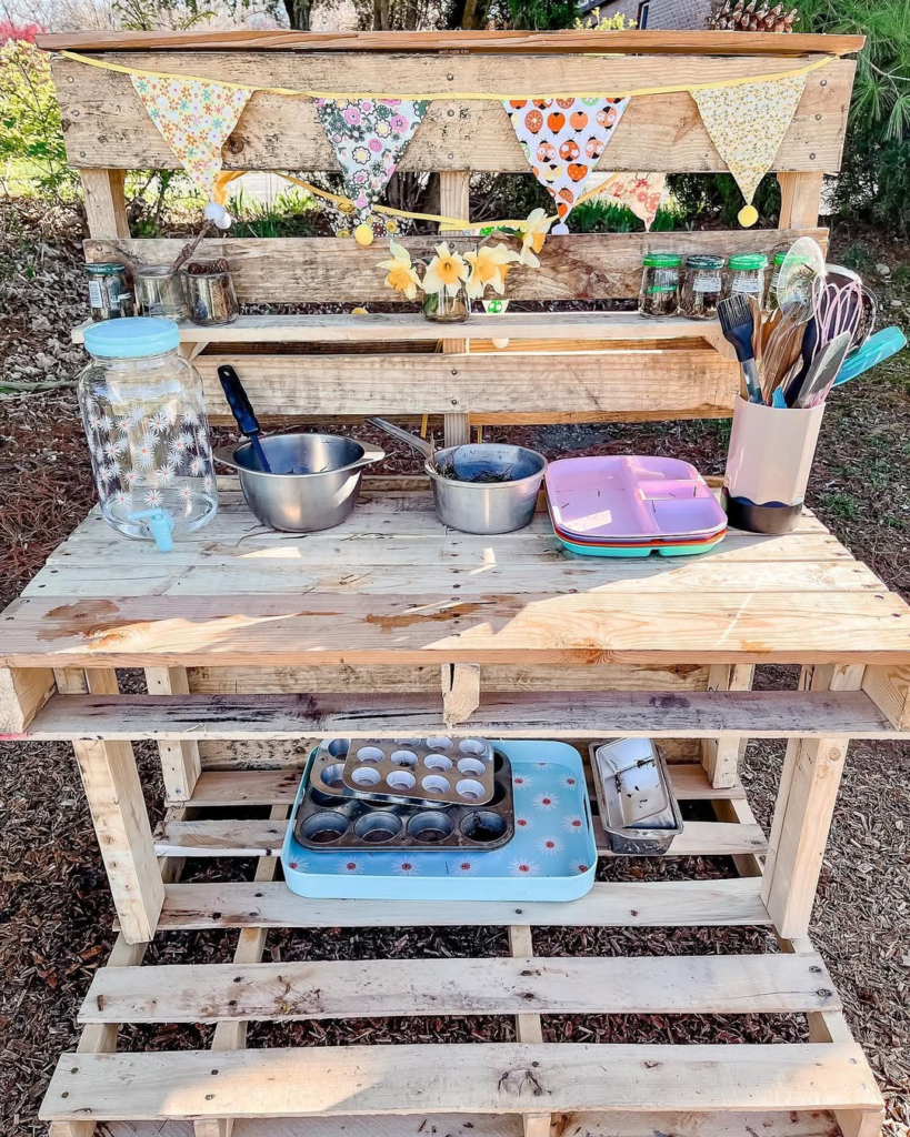 It’s amazing how simple pallets can transform into a fully functional mud kitchen. My kids love having multiple shelves to organize their mud creations.