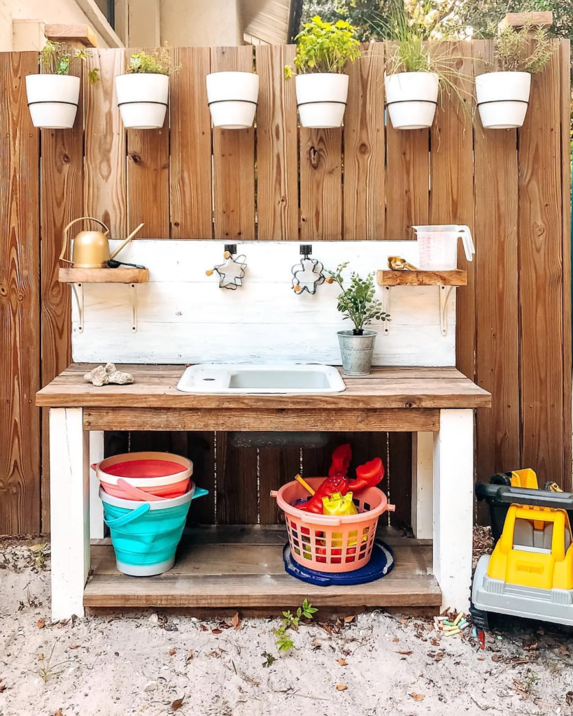 Transforming a garden bench into a mud kitchen is another clever idea. I added a shelf below and a small sink on one side. I like this because it combines seating and play in one compact space.