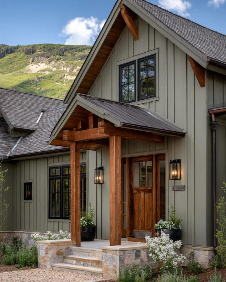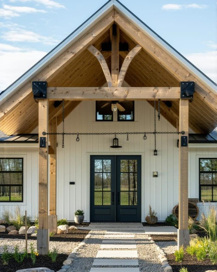 Exposed beams on the porch or entryway create a rustic, inviting vibe.