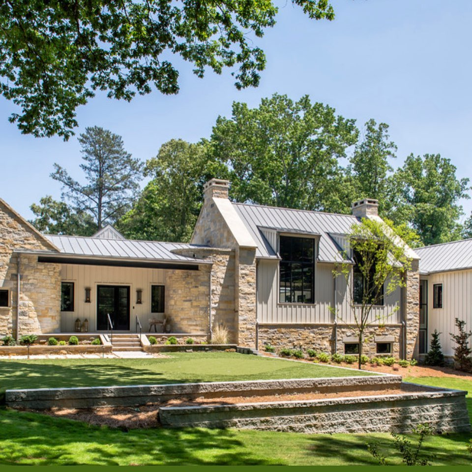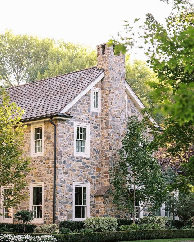 Stone adds texture, durability, and a grounded look to any farmhouse exterior.