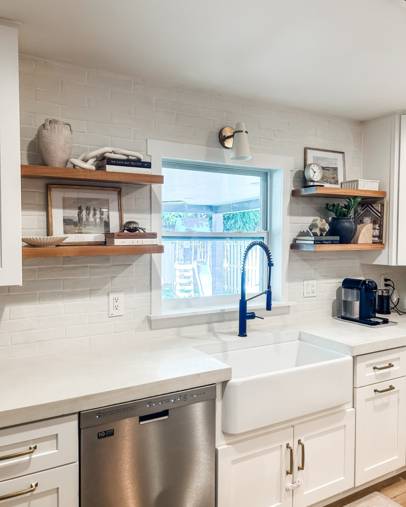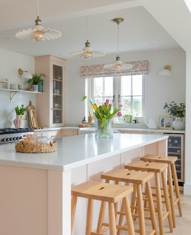 This one feels light and airy. Instead of closed cabinets, you display baskets, books, or pretty dishes. I like how it adds personality to the kitchen.