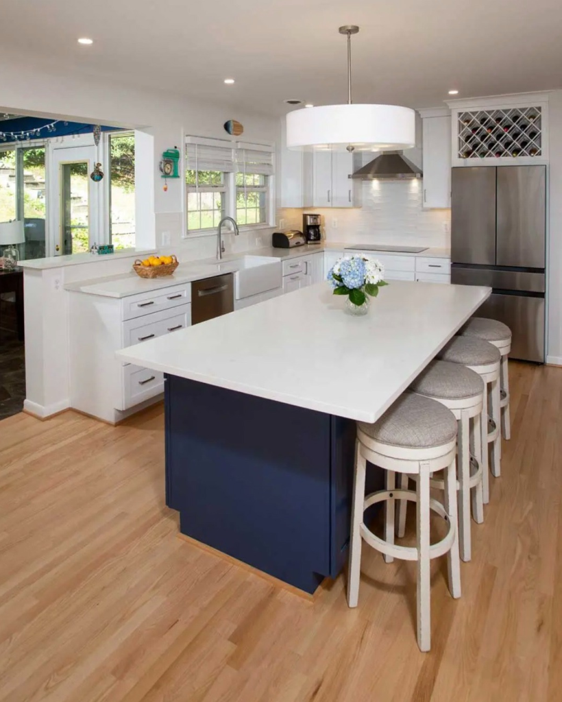 This layout gives you tons of workspace. I love how it creates separate zones for cooking and seating. It’s ideal for large kitchens.
