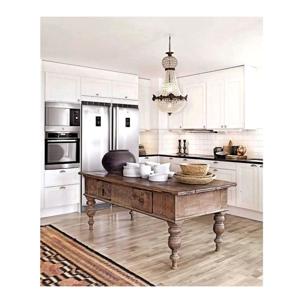 I’ve seen old tables turned into islands, and they look amazing. It’s perfect if you love vintage or handmade vibes. It makes the kitchen feel unique and personal.