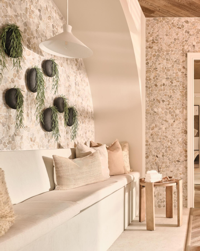 Warm neutrals, soft pastels, and earthy tones create a calm atmosphere.