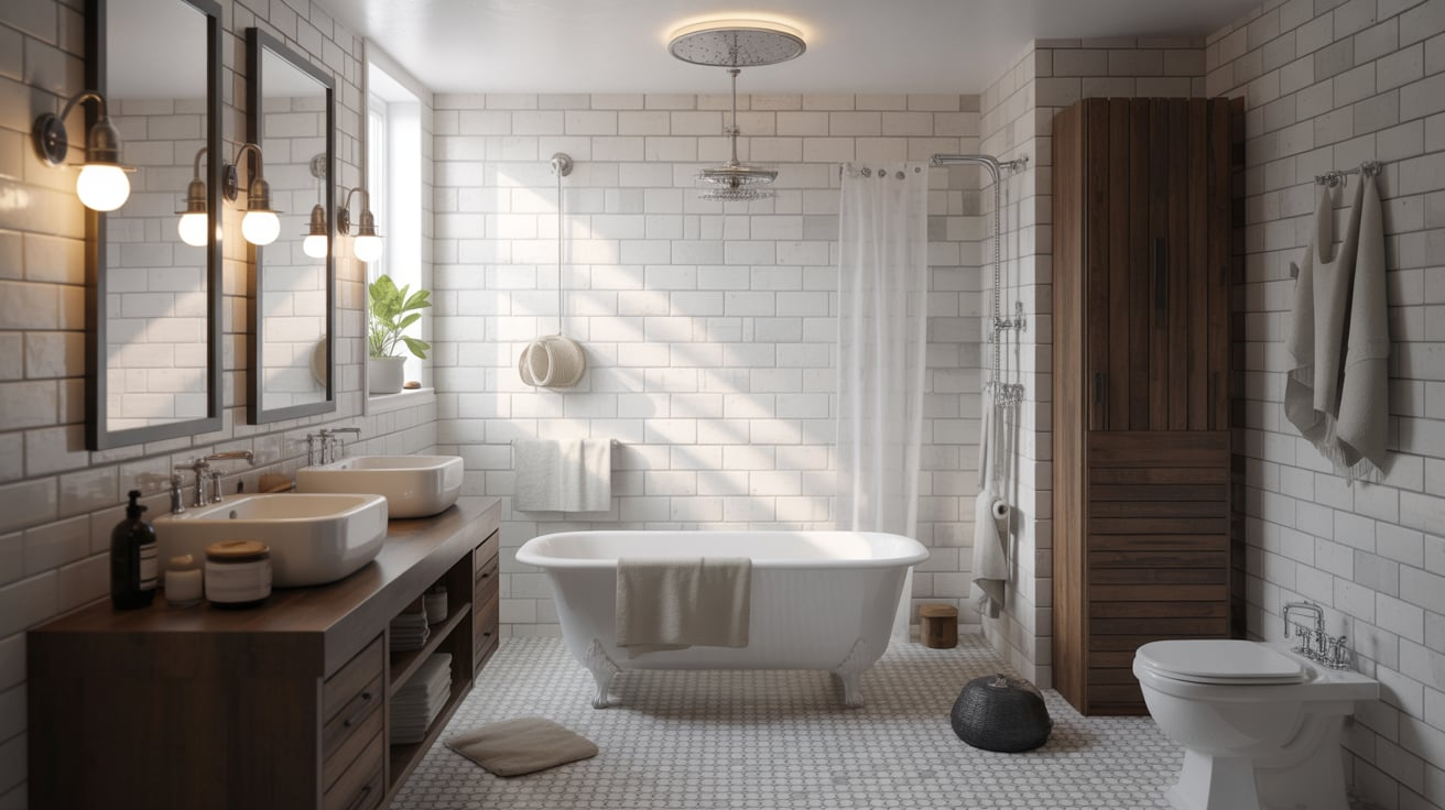 For a sleek, urban vibe, use black and white as your base palette. Think black faucets, white subway tiles, and dark grout lines. This timeless combo feels clean, structured, and distinctly industrial.
