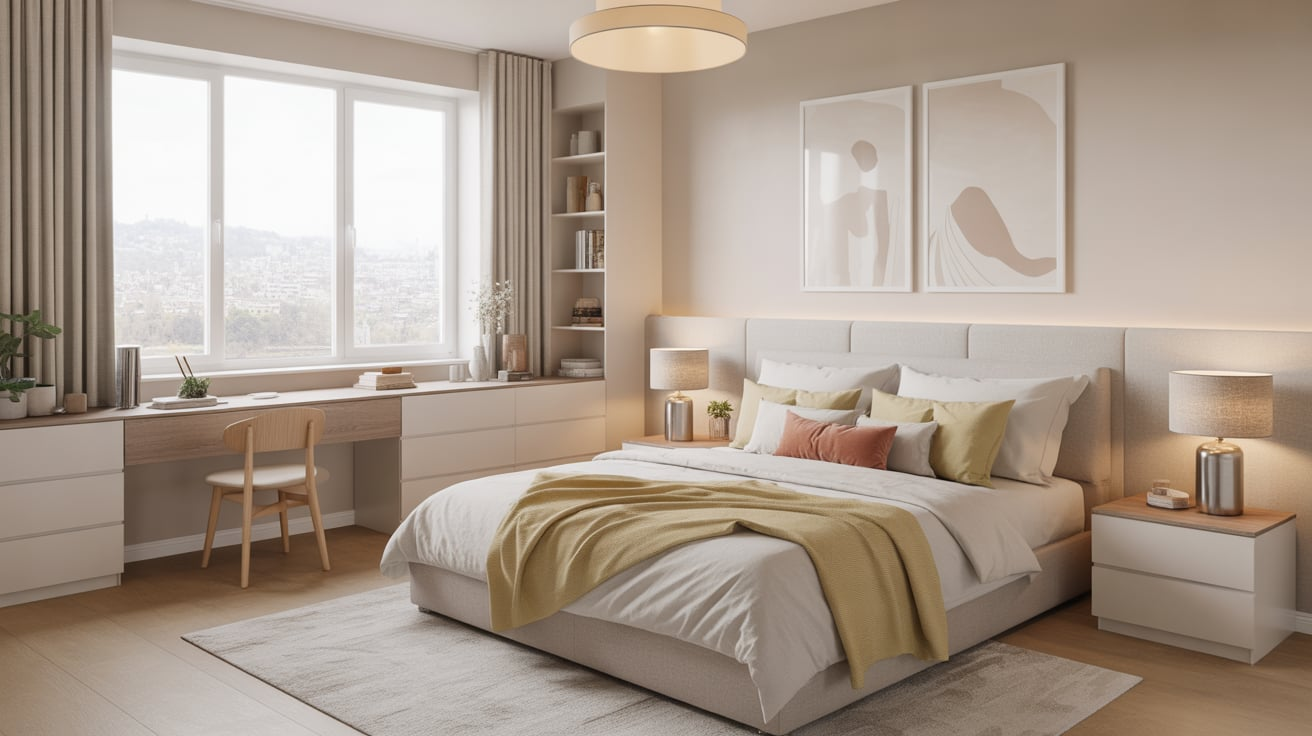 Clutter is the enemy of minimalism. Use smart storage solutions — like under-bed drawers, built-in wardrobes, or sleek storage benches — to keep your essentials out of sight.