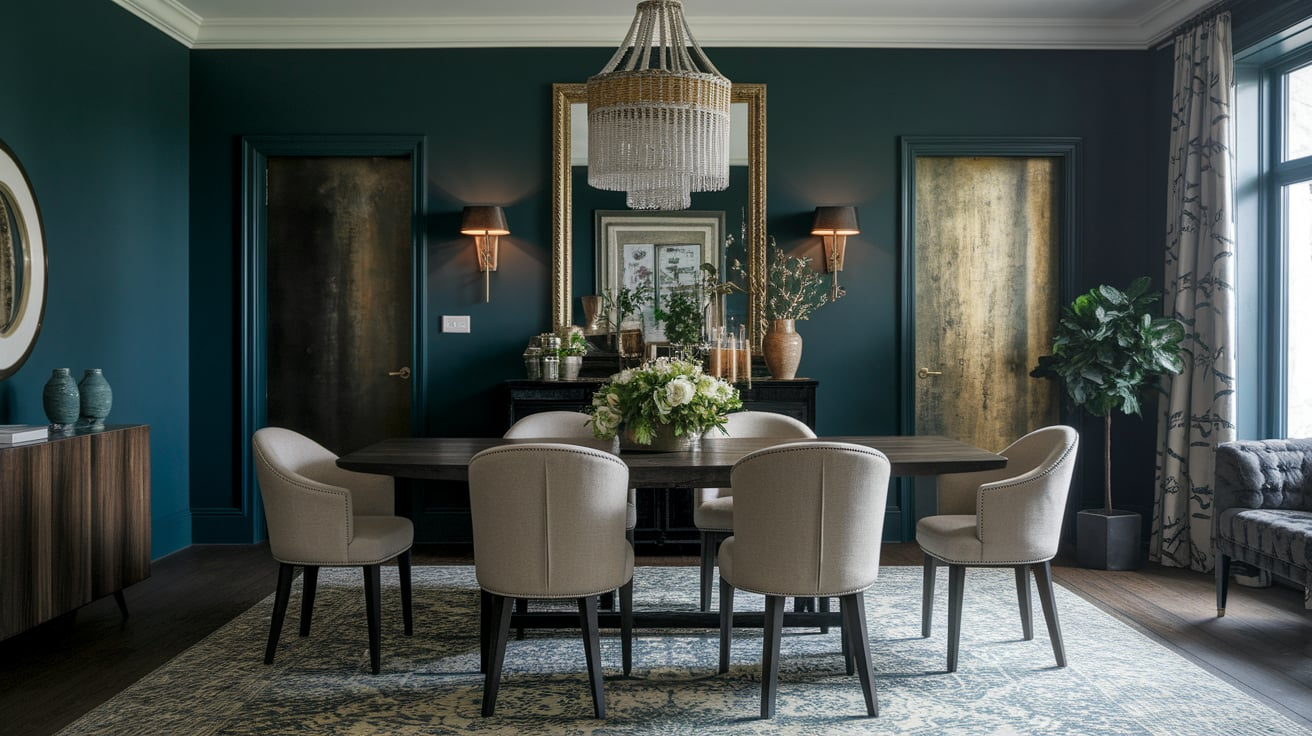 Nothing sets the tone for a moody dining room quite like dark, saturated walls. Shades like charcoal, deep navy, forest green, or even black instantly add drama.