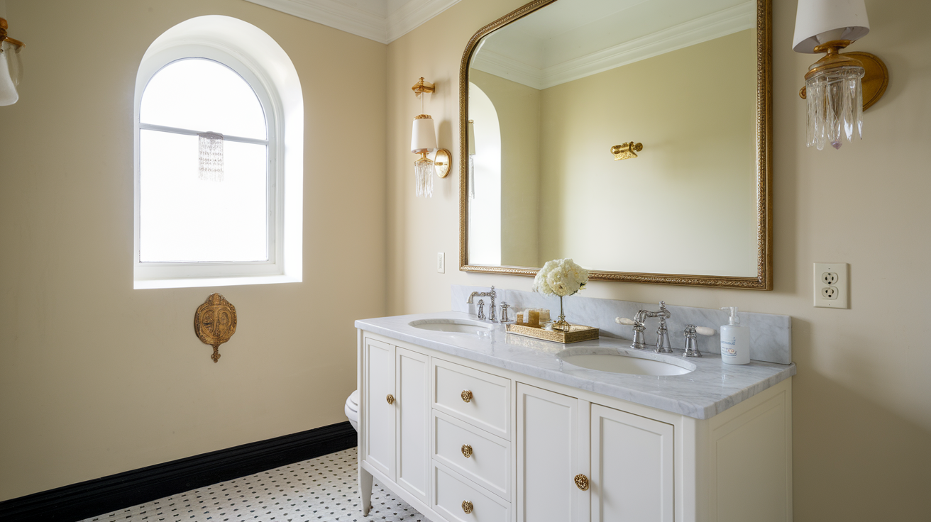 Adding metallics—gold-framed mirrors, copper sinks, or silver light fixtures—injects instant glamour.