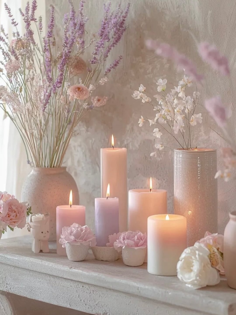 Candles are a classic mantel staple, and in spring, I like using pastel-colored candles. Soft pinks, blues, and yellows create a subtle yet cheerful vibe.