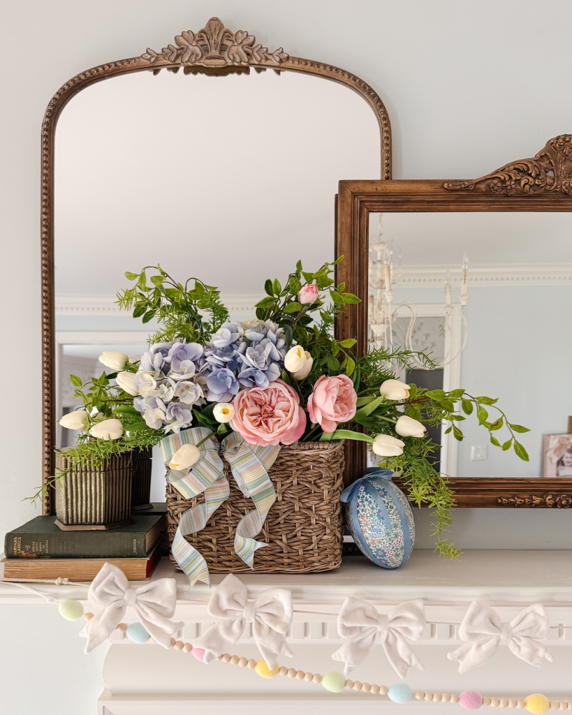 Finally, I always think about a cohesive color palette for the spring mantel. I like soft pastels, light neutrals, and pops of fresh green.