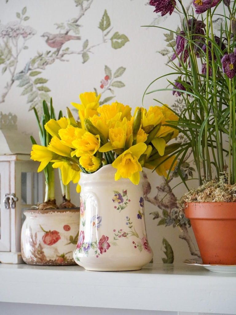 I like using white or pastel pitchers filled with tulips or daffodils. The unique shape of the pitcher adds visual interest, and it’s versatile because you can switch it out seasonally for other decor.