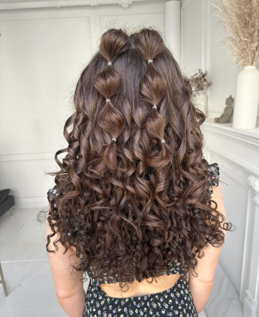 I part my hair down the middle and twist each section into two buns, leaving a few curls free. It’s fun, youthful, and perfect for a lively summer vibe.