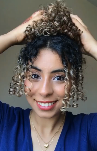 The pineapple updo is a summer essential for curly-haired girls like me. I pull all my curls to the top loosely and secure them with a soft scrunchie.